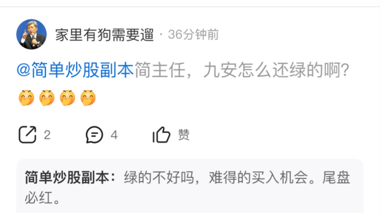 $九安医疗(SZ002432)$ 原来我们简主任每天都在左右脑互博啊,每天说九安要拉大阳,唱衰英科!结果今天又说九安绿着挺好@简单炒股副本 难道简主任是不喜欢赚钱?