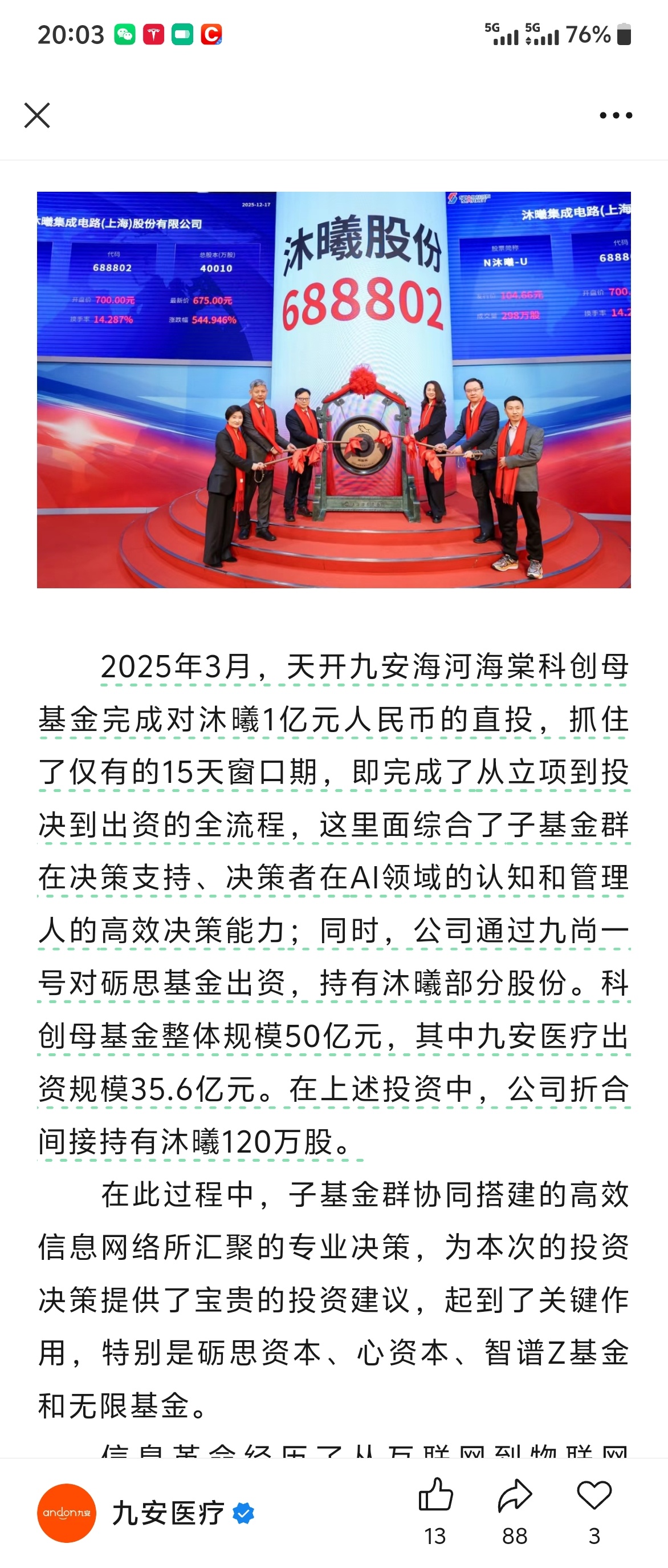 $九安医疗(SZ002432)$ 九安持股120万股,第一天浮盈8亿多
