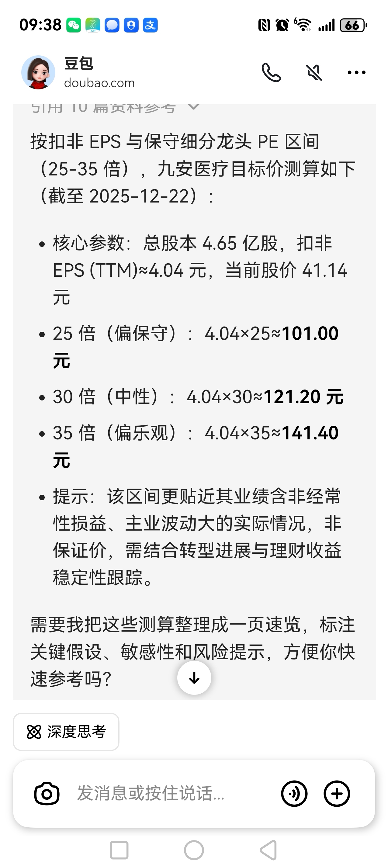 $九安医疗(SZ002432)$ 吓死我了,按照保守的估值计算,九安医疗都有100多元,这个是豆包查询的结果。