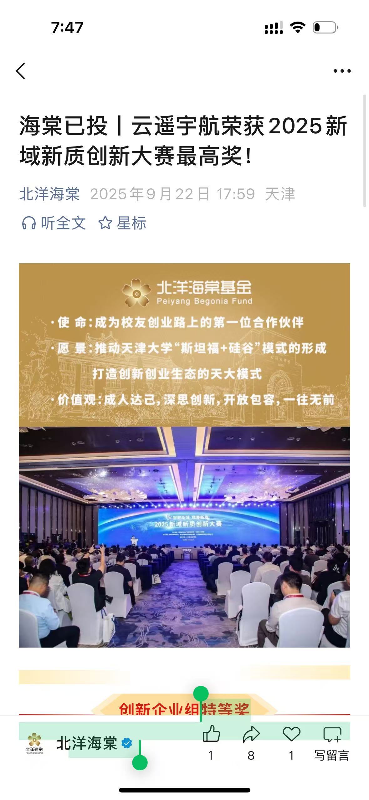 九安的母基金分别投资了云遥航天及航天驭星,两家航天公司,去年还发九安一号卫星