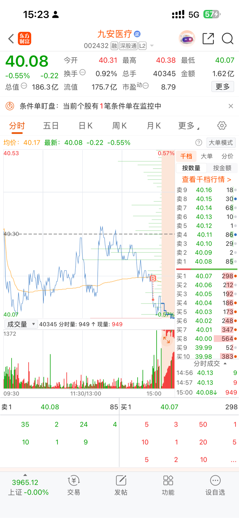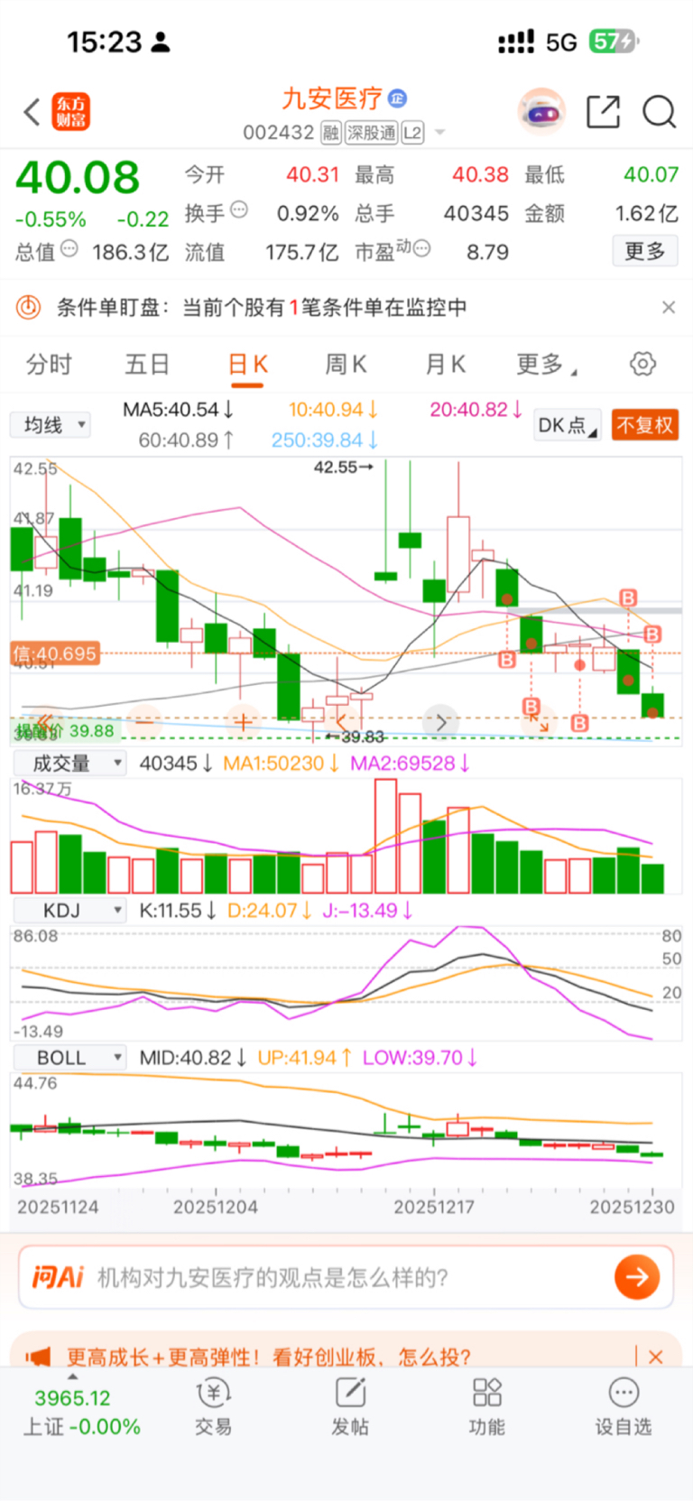 $九安医疗(SZ002432)$ 只要你的成本在缺口下方它就不会被套,大不了就是耗时间。目前股价已经运行在日线级别超卖区间,再者根据高点回调周期5/8个交易日,明天是本轮调整的最后一天,所以最后一笔加仓就设置在3985附近,这里是前低点也是年线的双重支撑位置,一般不会轻易跌破