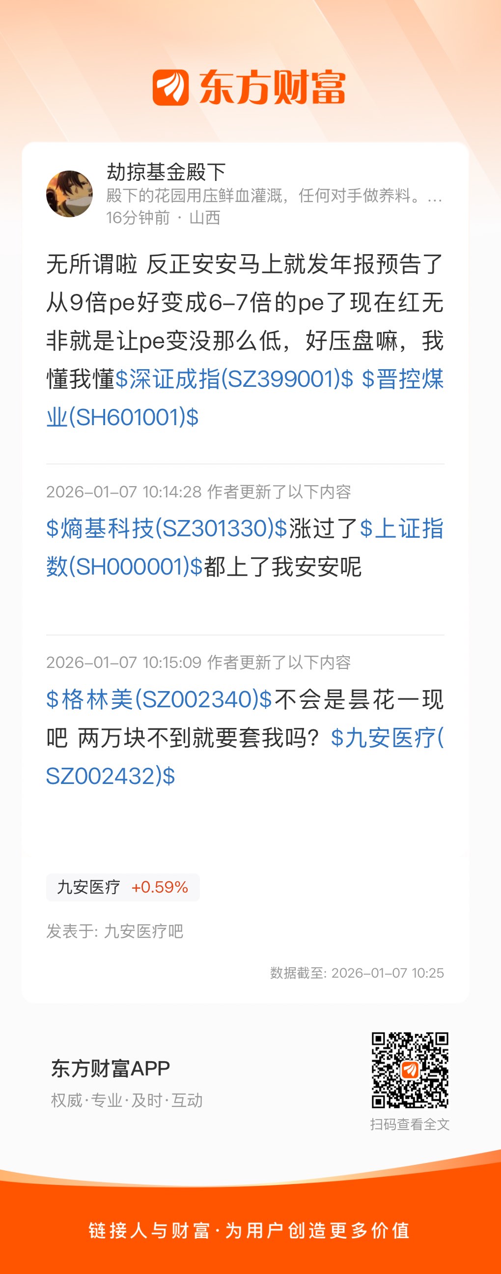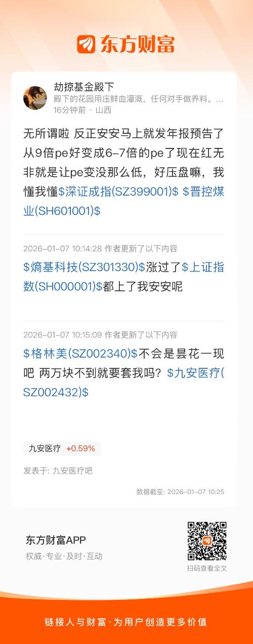 无所谓啦 反正安安马上就发年报预告了 从9倍pe好变成6-7倍的pe了现在红无非就是让pe变没那么低,好压盘嘛,我懂我懂$深证成指(SZ399001)$ $晋控煤业(SH601001)$