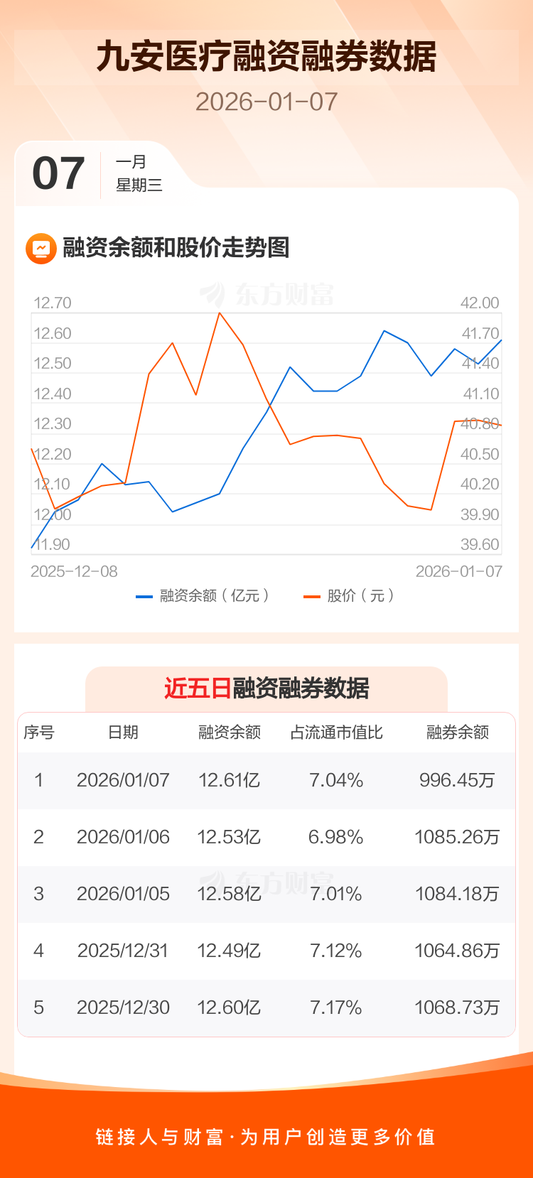 交易所最新数据显示,九安医疗于2026年1月7日获融资买入5000.26万元,融资偿还4248.61万元,当日融资净买入751.65万元。目前,该股融资余额12.61亿,占流通市值比例为7.04%。
