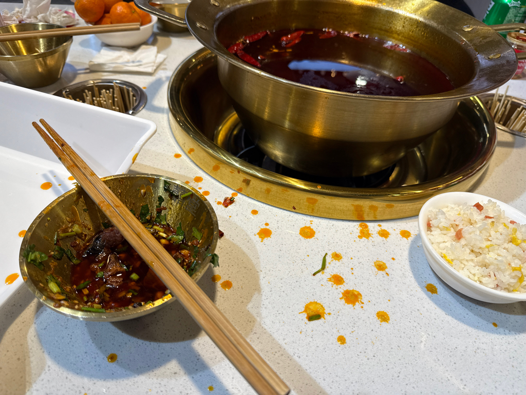 我来重庆真是天天吃串串,吃什么男的一掌哎呀不行了,我下礼拜走呀,吃点江浙菜回回味