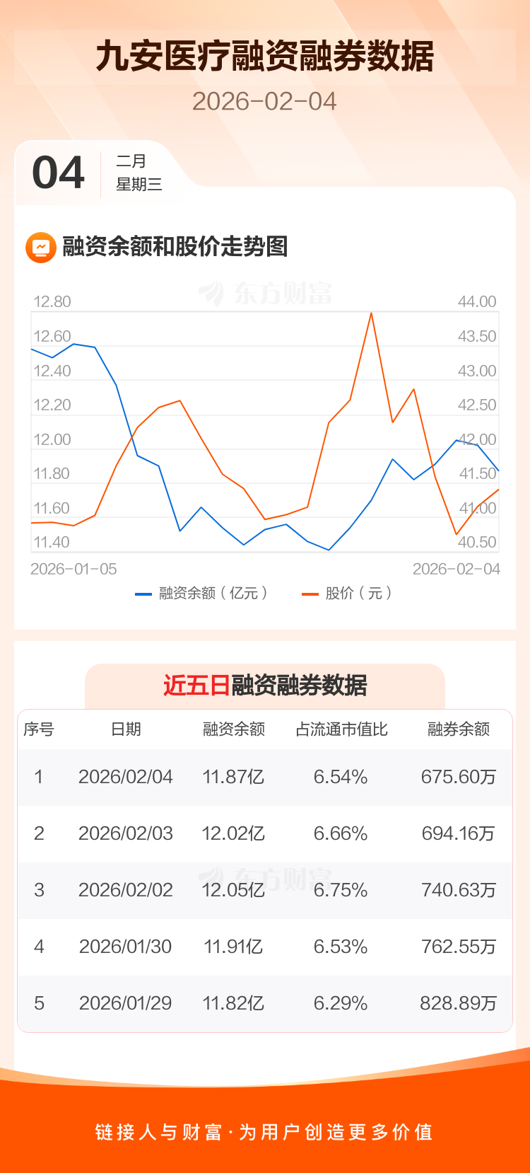 交易所最新数据显示,九安医疗于2026年2月4日获融资买入3322.57万元,融资偿还4857.34万元,当日融资净偿还1534.77万元。目前,该股融资余额11.87亿,占流通市值比例为6.54%。