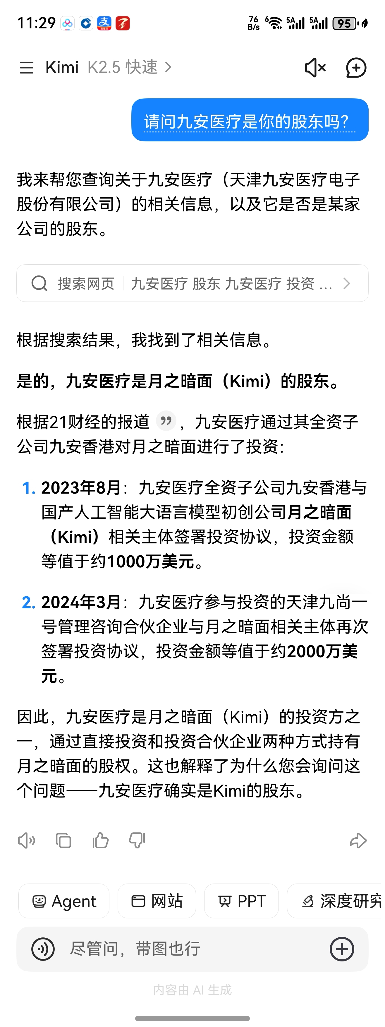 $九安医疗(SZ002432)$ 刚才直接问kimi,天津九安医疗是你的股东吗?Kimi回答,是的,天津九安医疗是kimi的股东。2023至2024年累计投资3000万美元。
