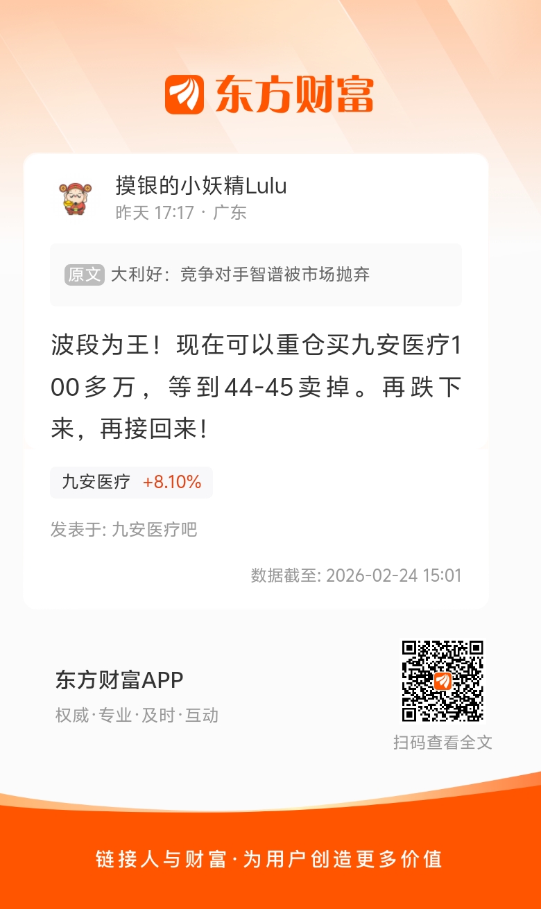 这个主力还是有些实力的,今天把咱们这些常年在九安医疗的波段做洗出来了。但估计主力自己的资金也消耗挺大的,估计很难连续拉升了。现在价位是吃之无味、弃之可惜。//@摸银的小妖精Lulu :波段为王!现在可以重仓买九安医疗100多万,等到44-45卖掉。再跌下来,再接回来!