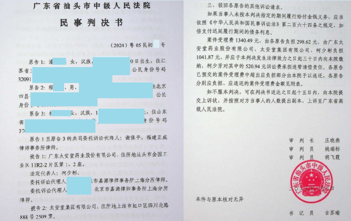 | 2025年8月8日的一审胜诉通知书具有双重价值:为后续案件提供了强有力的司法示范。诉讼时段:2018年11月23日至2023年4月30日之间买入002433太安堂,且在2023年5月4日(含当日)之后卖出或继续持有者,以上索赔登记条件仅代表证威律所观点。不作为任何证券投资决策和买卖建议,最终以法院的认定结果为准。 了解更多点头像看企业信息 或 查看 证威律所 相关信息 |