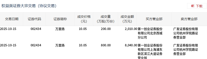 万里扬今日大宗交易折价成交1000万股,成交额1.01亿元