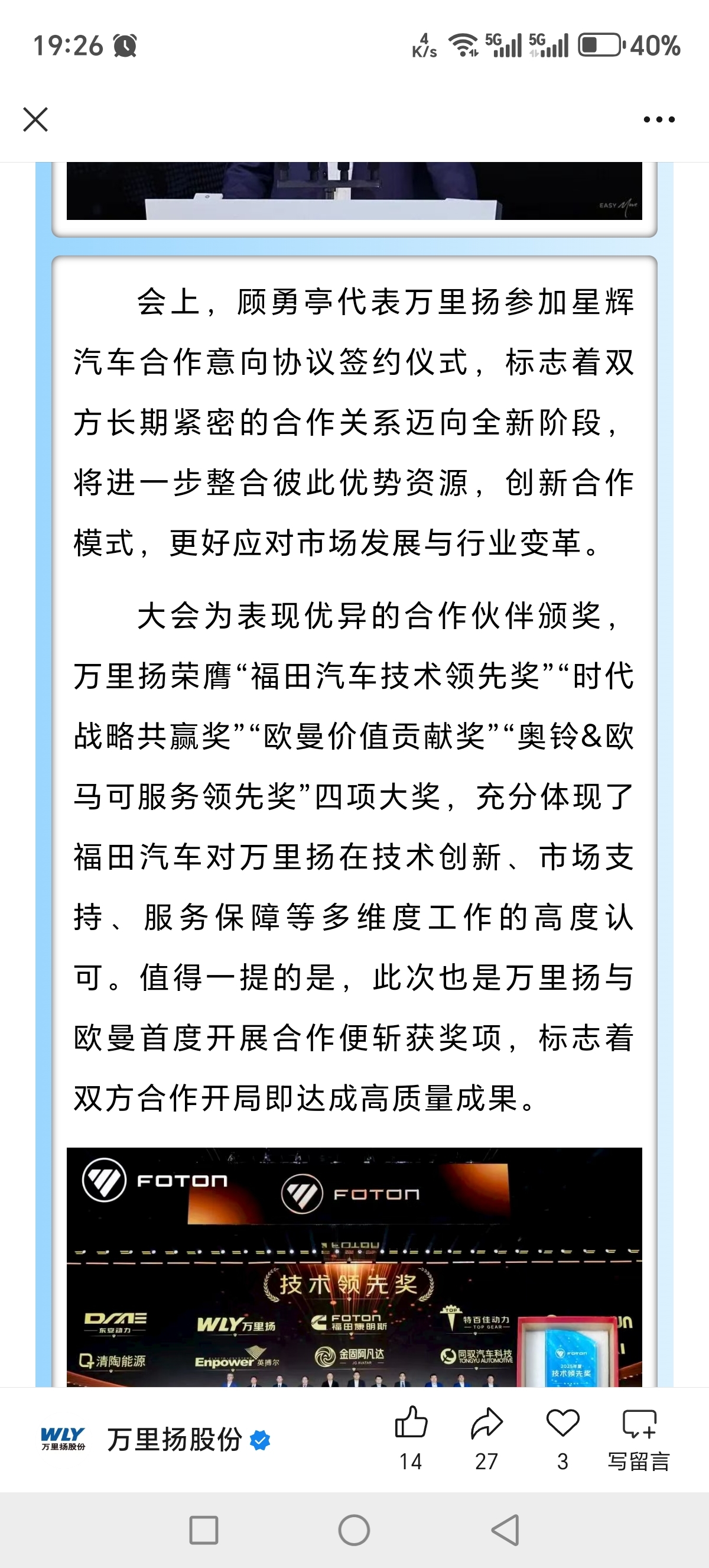 $万里扬(SZ002434)$ 天天净整没用的,又是福田,又是陕汽,没一点用,你啥时候能跟宇树,特斯拉签订合作协议,才有点儿看头