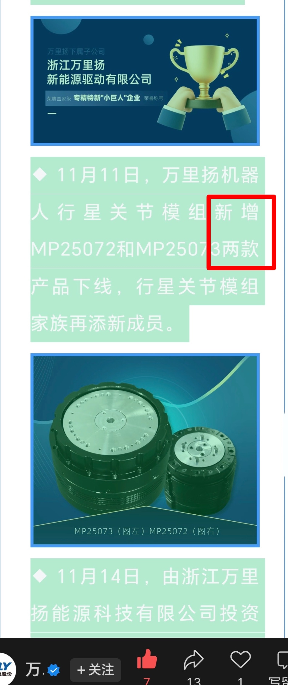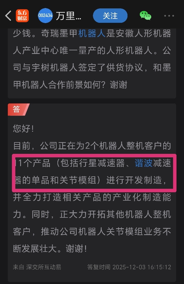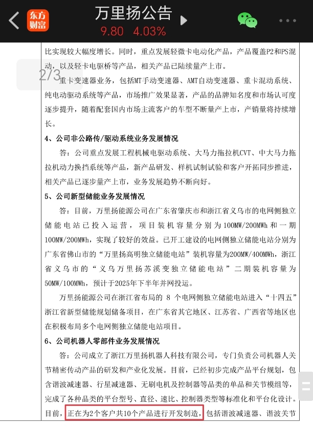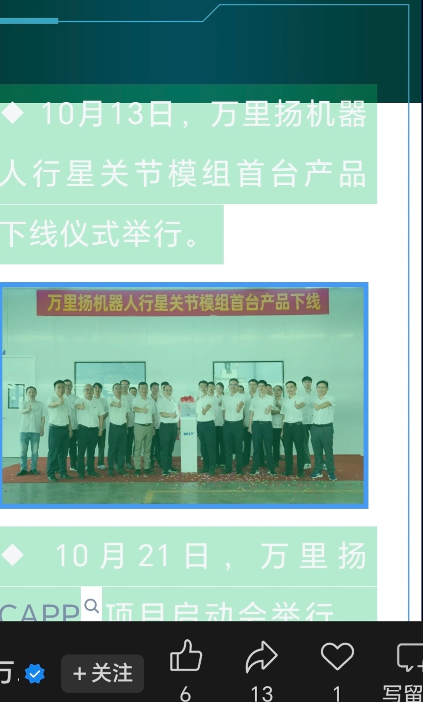 其实,关键并不在于此。而在于这两个客户对万里扬机器人关节精密传导产品的设计、加工及完成制造的全方位满意与认可。看来,量产及批量供货快了!
