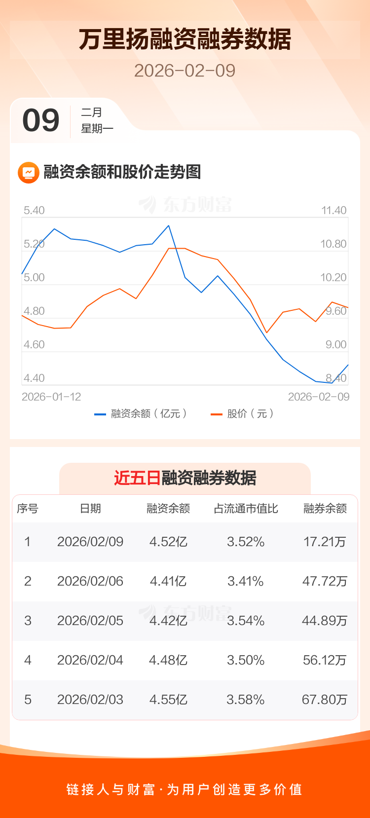 交易所最新数据显示,万里扬于2026年2月9日获融资买入3460.62万元,融资偿还2442.30万元,当日融资净买入1018.32万元。目前,该股融资余额4.52亿,占流通市值比例为3.52%。