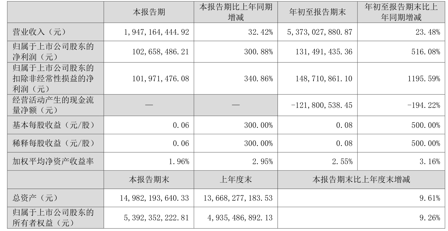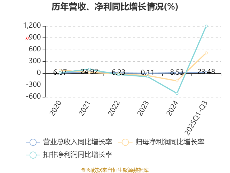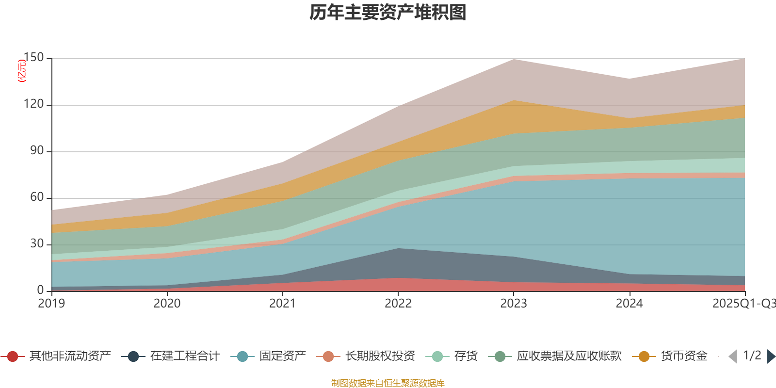 资产重大变化方面,截至2025年三季度末,公司固定资产较上年末增加2.63%,占公司总资产比重下降2.87个百分点;应收票据及应收账款较上年末增加20.27%,占公司总资产比重上升1.53个百分点;其他非流动资产较上年末减少23.83%,占公司总资产比重下降1.08个百分点;货币资金较上年末增加33.06%,占公司总资产比重上升0.97个百分点。