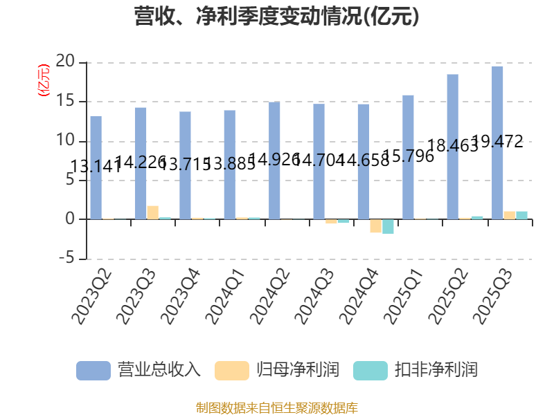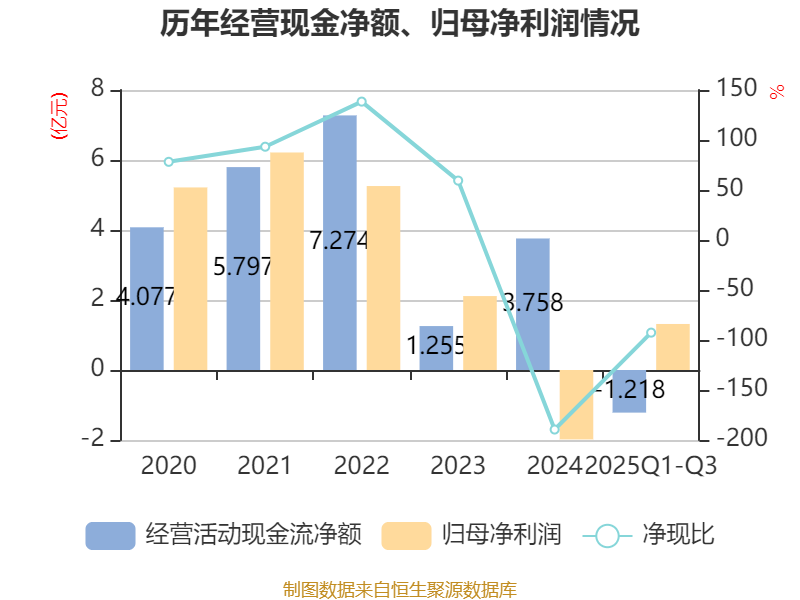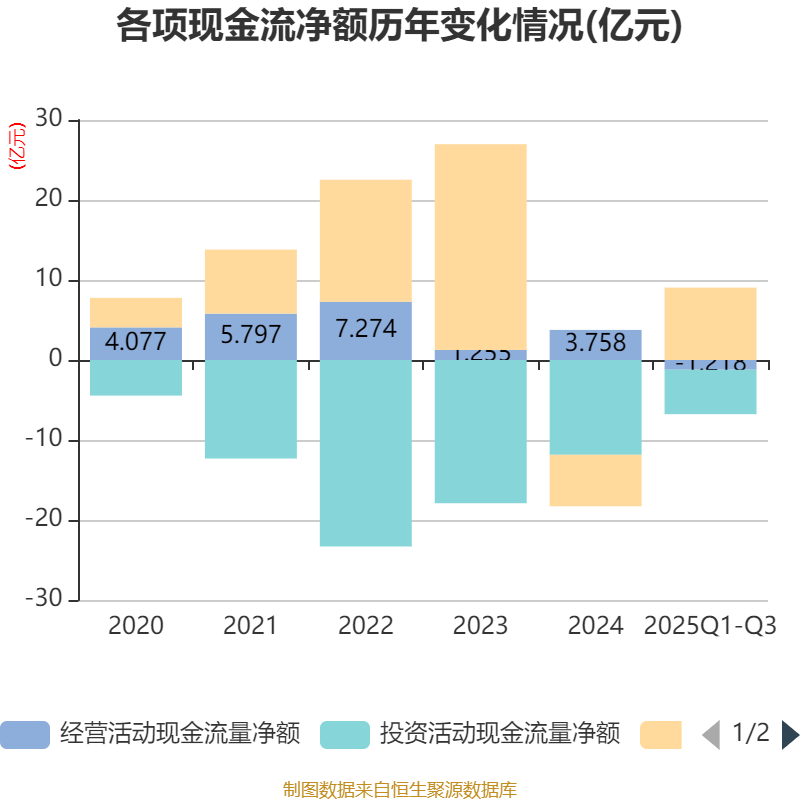 2025年前三季度,公司经营活动现金流净额为-1.22亿元,同比减少2.51亿元;筹资活动现金流净额9.05亿元,同比增加7.81亿元;投资活动现金流净额-5.55亿元,上年同期为-11.34亿元。