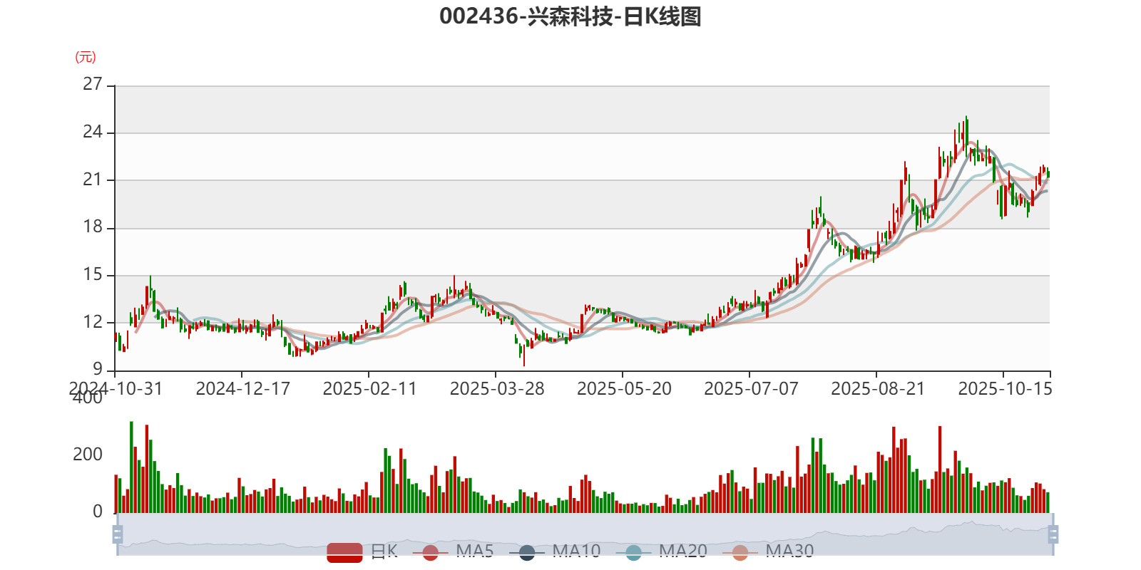 中证智能财讯兴森科技(002436)10月31日披露2025年第三季度报告。前三季度公司实现营业总收入53.73亿元,同比增长23.48%;归母净利润1.31亿元,同比扭亏;扣非净利润1.49亿元,同比扭亏;经营活动产生的现金流量净额为-1.22亿元,上年同期为1.29亿元;报告期内,兴森科技基本每股收益为0.08元,加权平均净资产收益率为2.55%。
