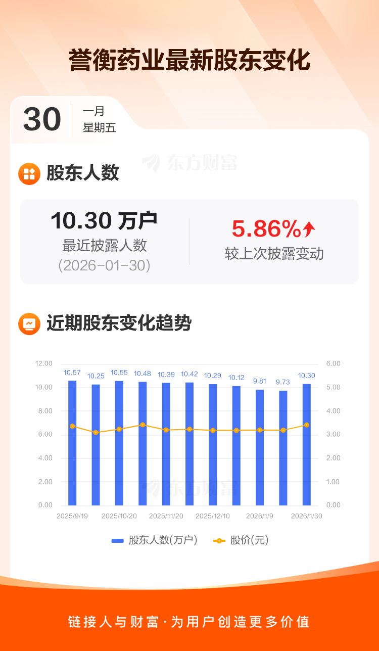 誉衡药业:截至1月30日最新股东户数10.30万户,较上期增加5.86%