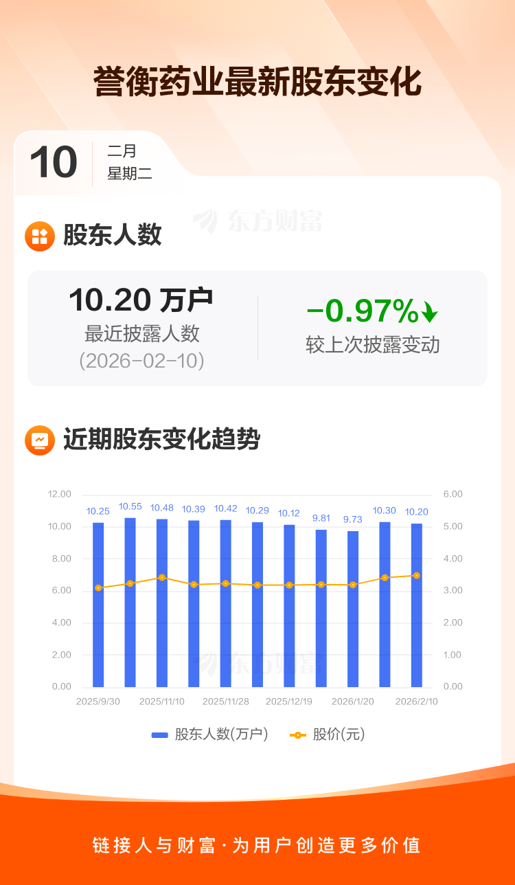 誉衡药业:截至2月10日最新股东户数10.20万户,较上期减少0.97%
