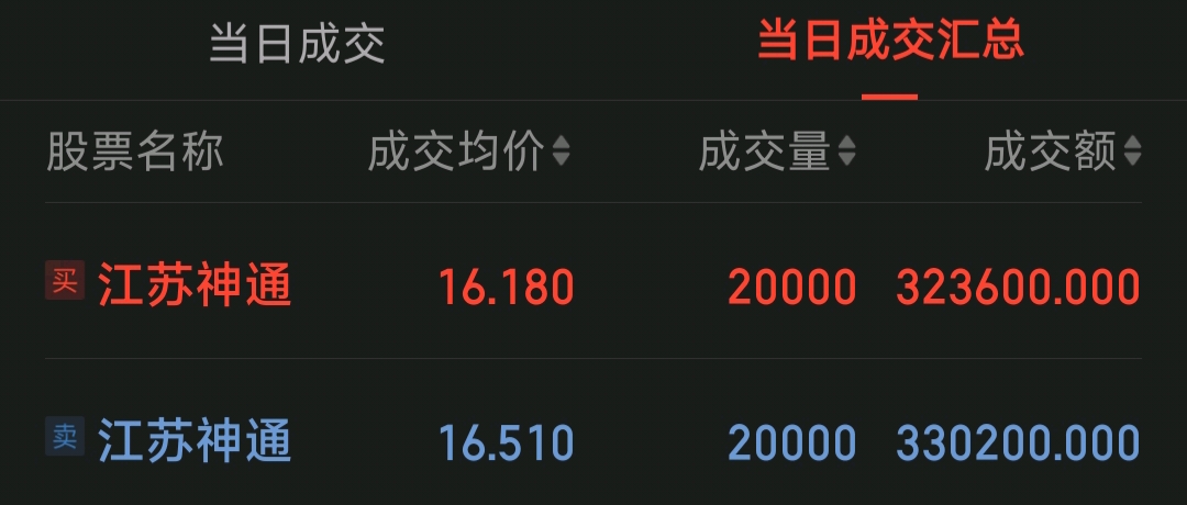 $江苏神通(SZ002438)$ 成功一踢。16.51-16.18=0.33*20000=6600-300=6300到手。