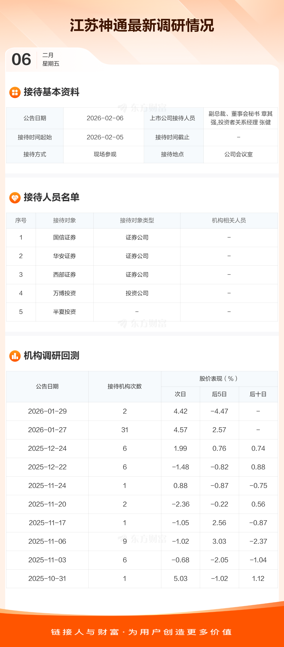 江苏神通2月6日公告称,2月5日接待国信证券等5家机构调研。接待人员包括副总裁、董事会秘书 章其强,投资者关系经理 张健。