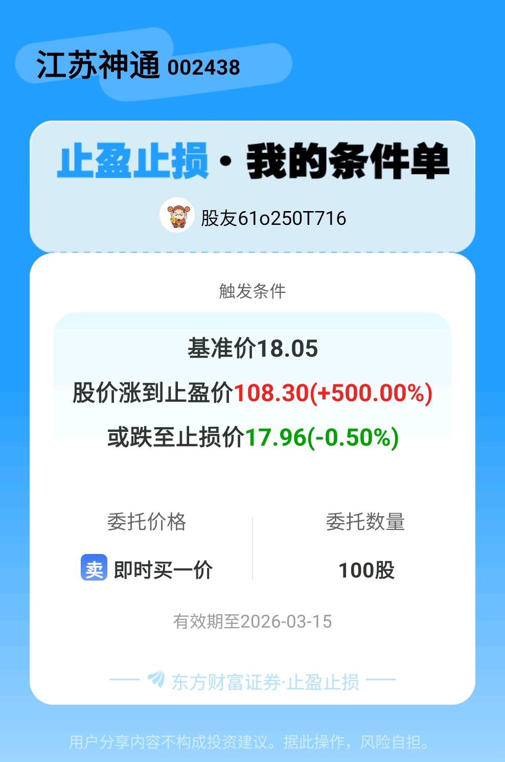 #条件单交流# #止盈止损晒单# 一位股神设置了一个止盈止损条件单,接下来就是见证奇迹的时刻~$江苏神通(SZ002438)$