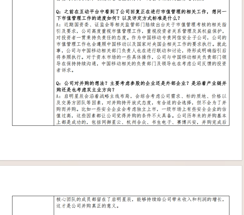 作为中国移动专责网信安全子公司,公司的市值管理工作也会遵照中国移动以及国家对央国