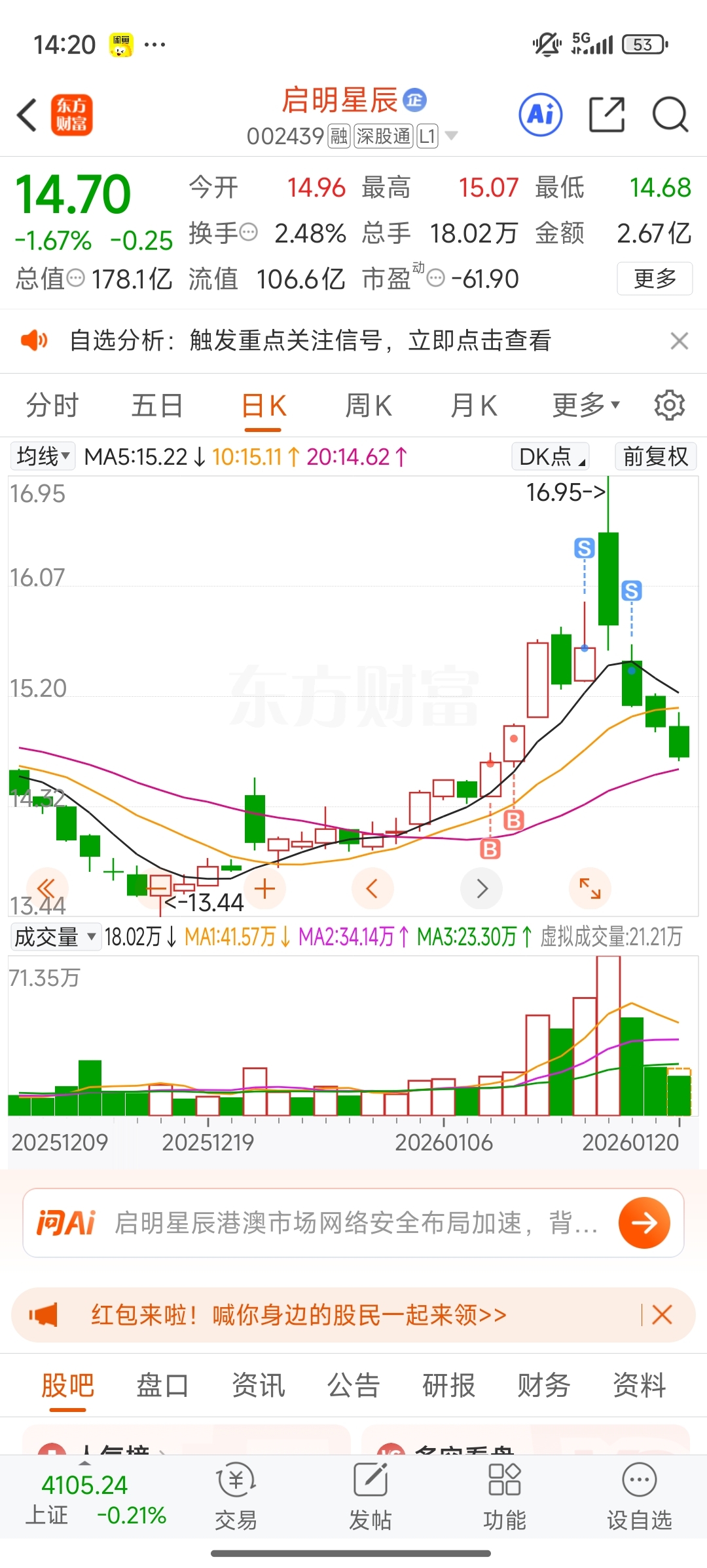 亲爱的启明星辰主力,我希望你今天跌三个点,明天再阴跌两个点。然后我慢慢买入,继续