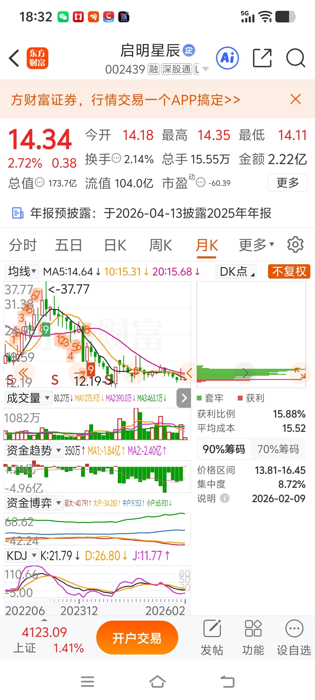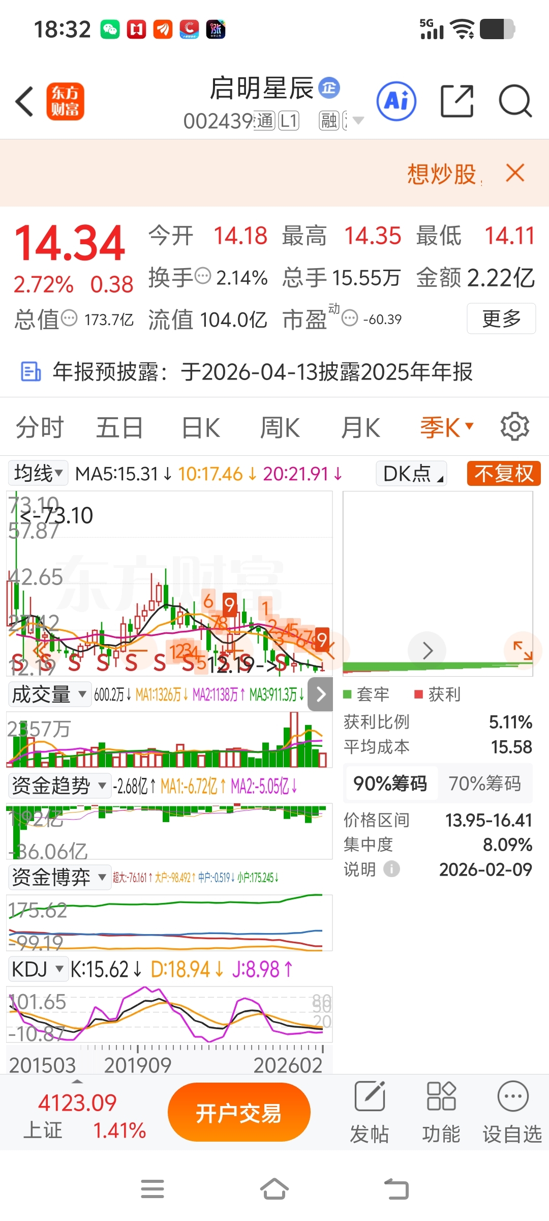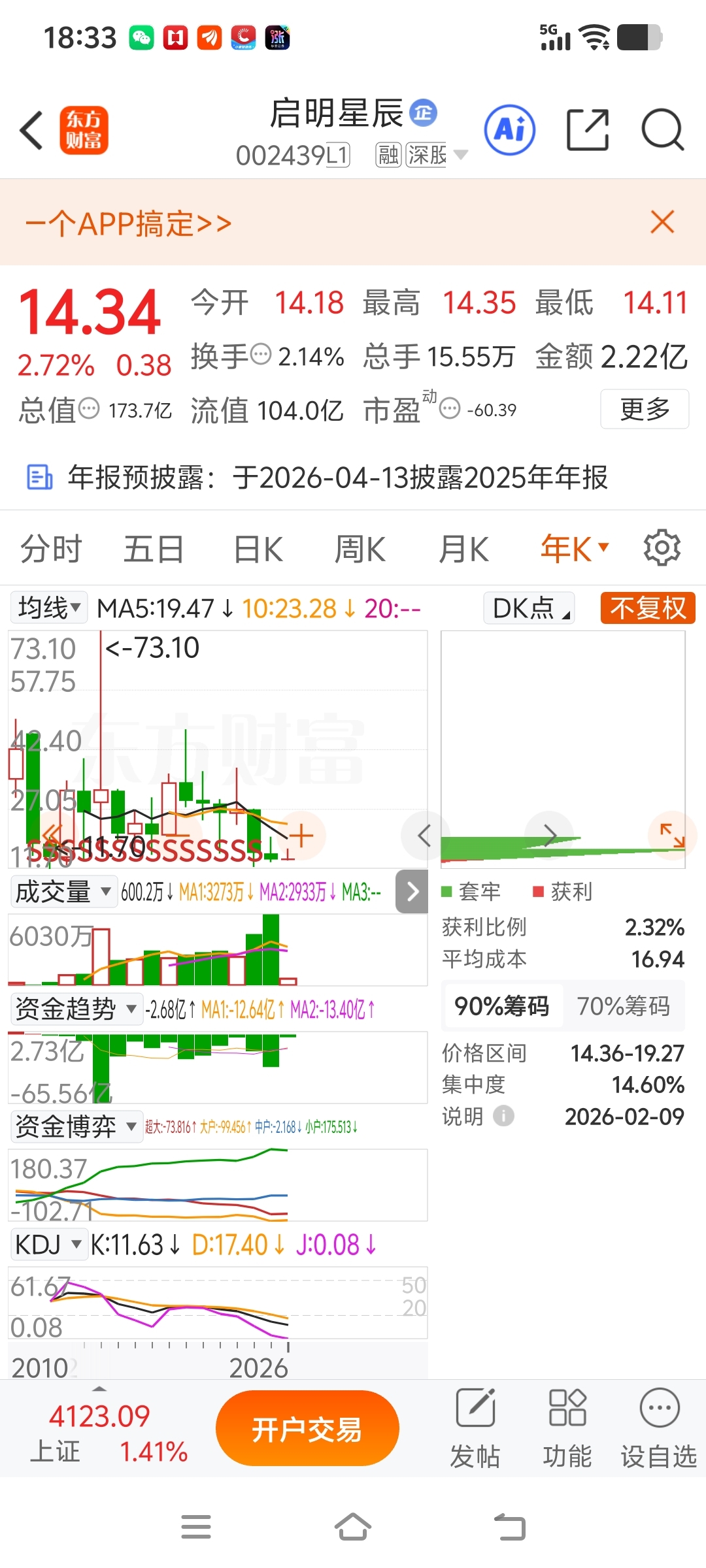 这股今天尾盘集合竞价14.34买的,买的理由创了历史新低今天缩量拉升才买的,这股