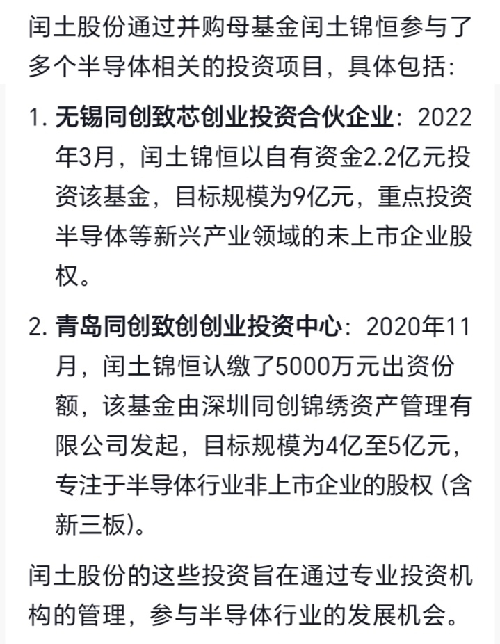 闰土股份通过并购母基金闰土锦恒参与了多个半导体相关的投资项目。