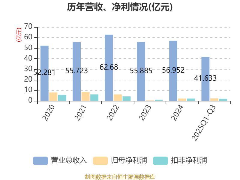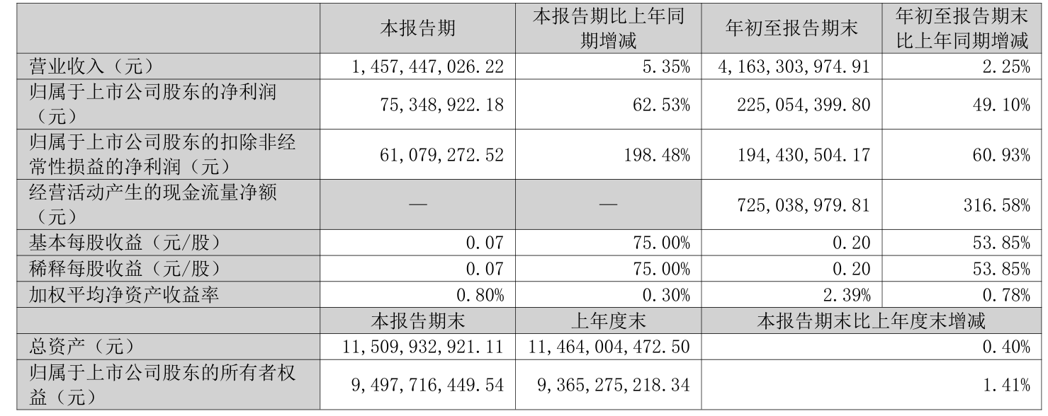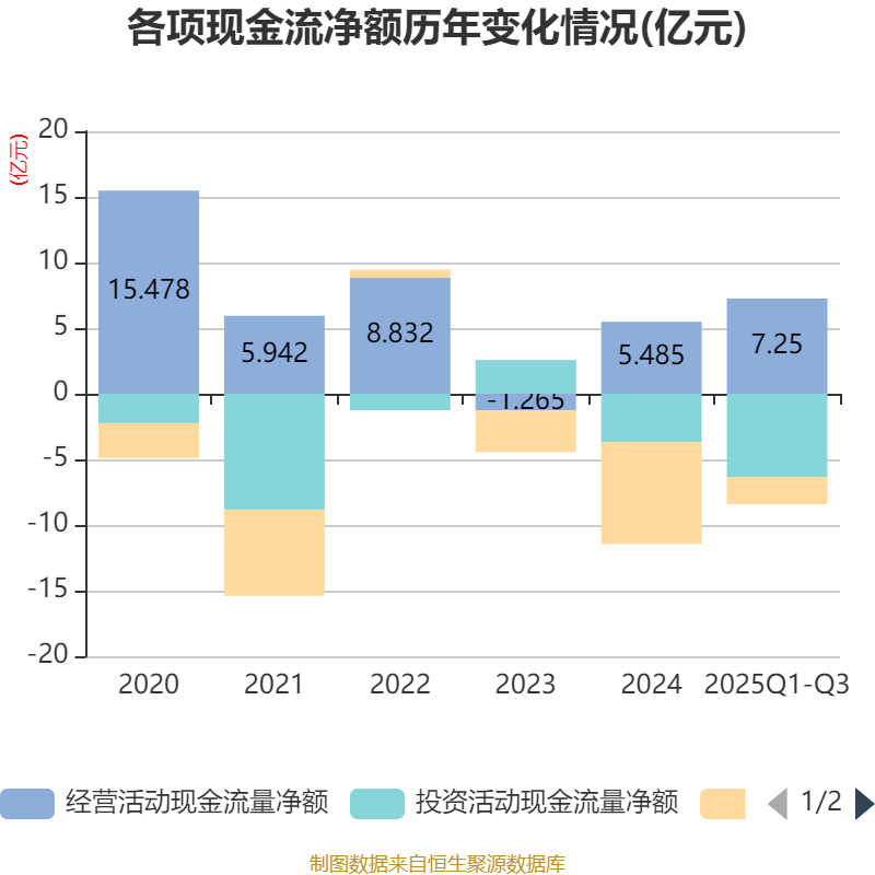 2025年前三季度,公司经营活动现金流净额为7.25亿元,同比增长316.58%;筹资活动现金流净额-2.06亿元,同比增加9655.17万元;投资活动现金流净额-6.35亿元,上年同期为7647.81万元。