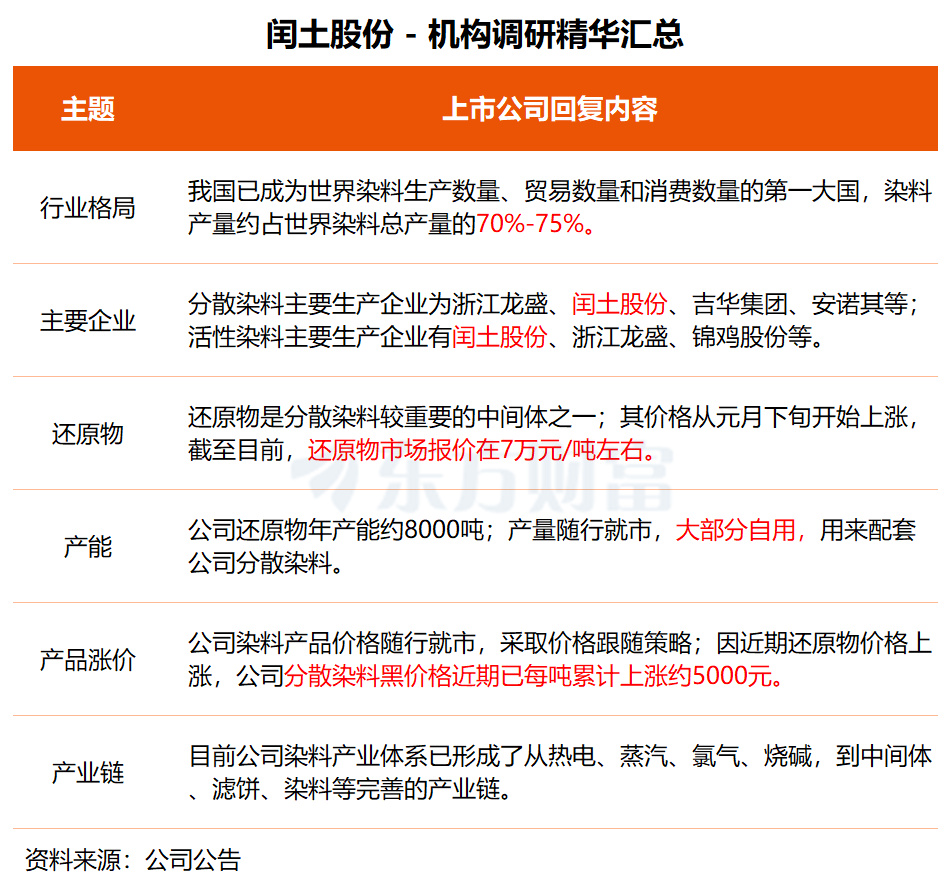 在调研中,闰土股份透露,因近期还原物价格上涨,公司分散染料黑价格近期已每吨累计上涨约5000元。