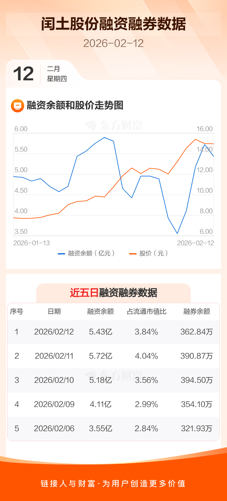 交易所最新数据显示,闰土股份于2026年2月12日获融资买入1.72亿元,融资偿还2.00亿元,当日融资净偿还2895.86万元。目前,该股融资余额5.43亿,占流通市值比例为3.84%。