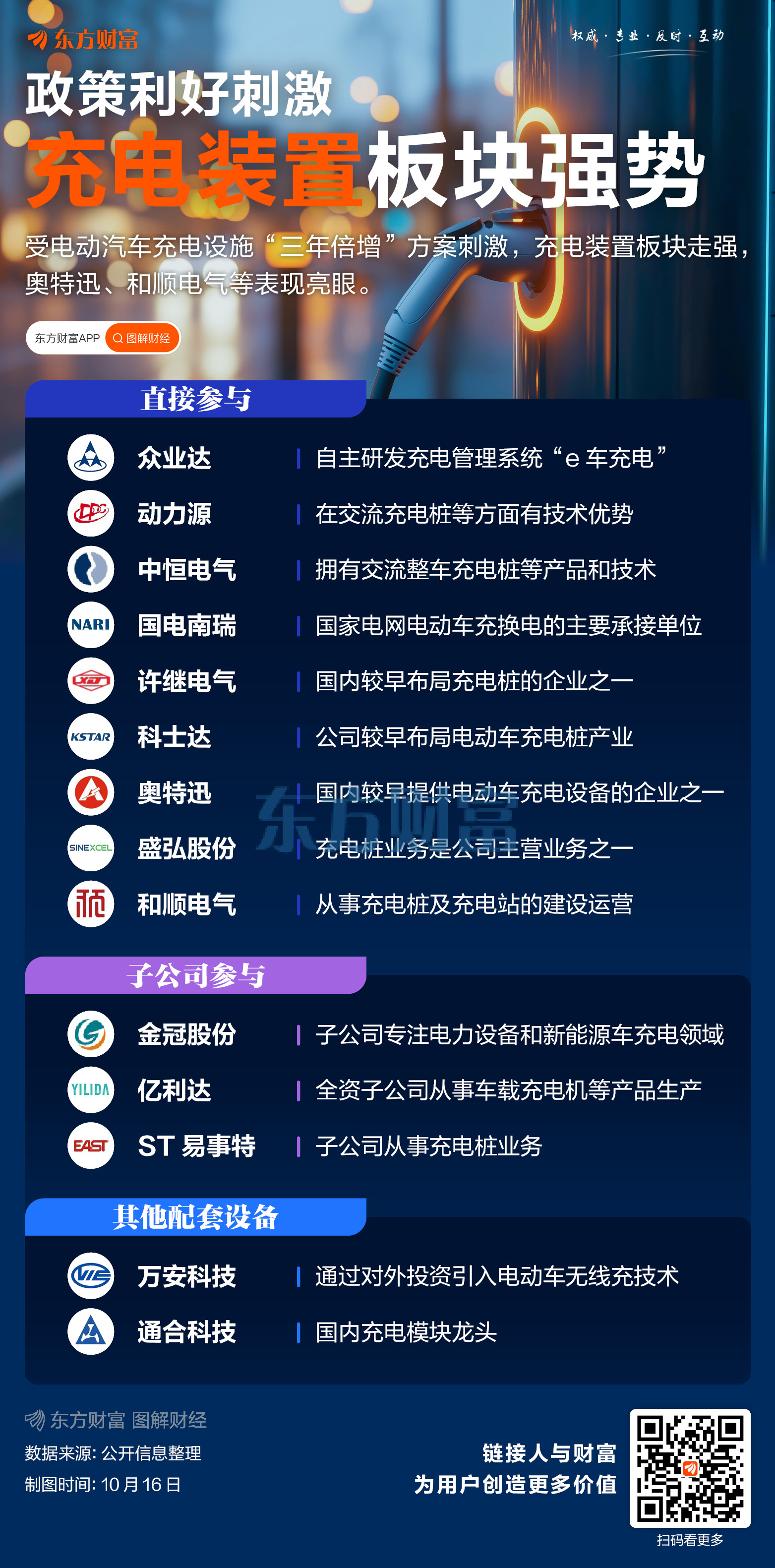 充电装置板块10月16日表现强势,板块中奥特迅涨停,和顺电气在昨日涨停后继续大涨6.15%,动力源、ST易事特也涨幅靠前。