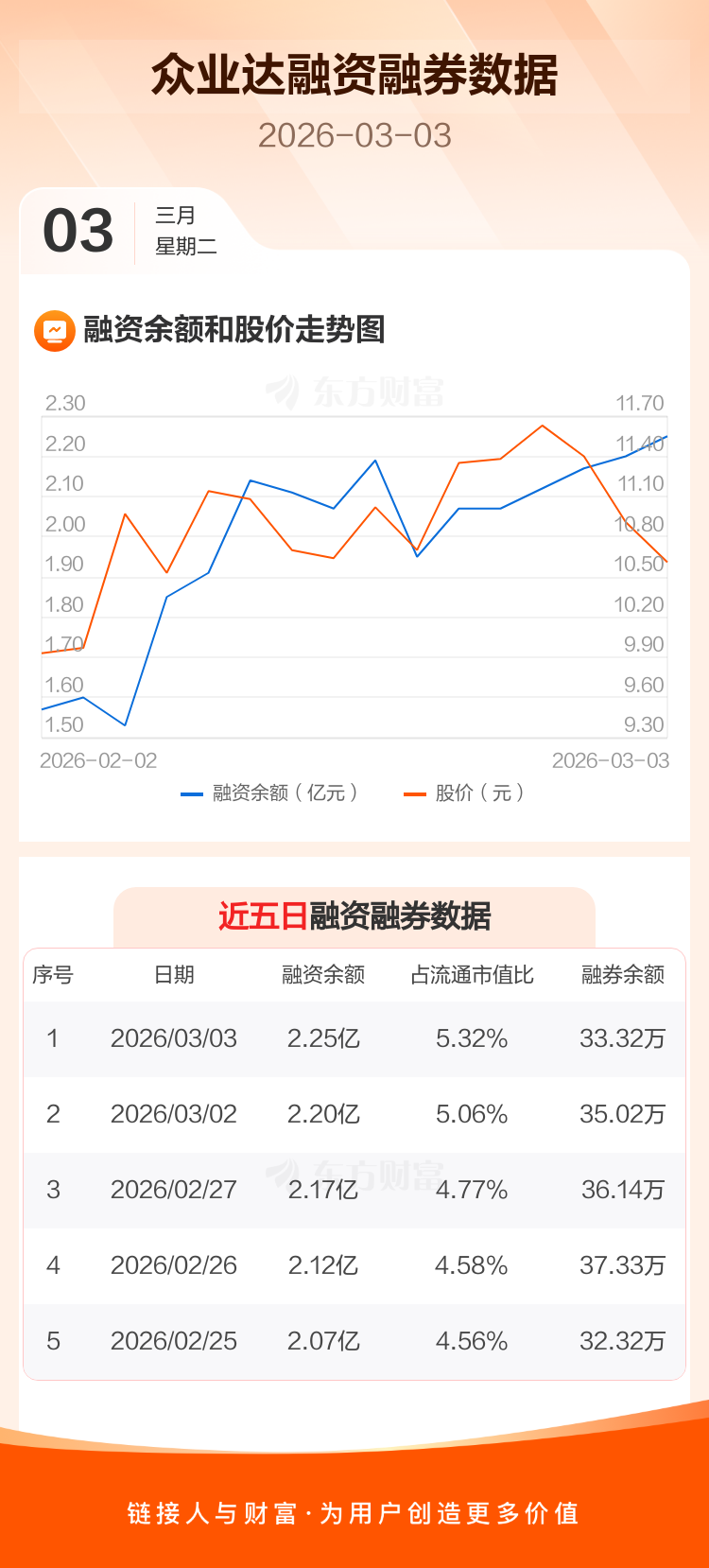 交易所最新数据显示,众业达于2026年3月3日获融资买入3283.46万元,融资偿还2798.89万元,当日融资净买入484.57万元。目前,该股融资余额2.25亿,占流通市值比例为5.32%。