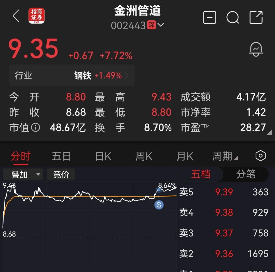 $金洲管道(SZ002443)$ 9.34元尾盘卖了