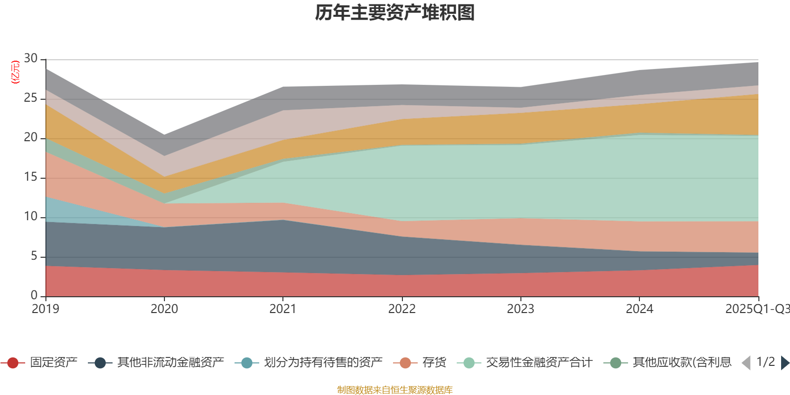 资产重大变化方面,截至2025年三季度末,公司应收票据及应收账款较上年末增加43.79%,占公司总资产比重上升4.9个百分点;其他非流动金融资产较上年末减少35.27%,占公司总资产比重下降3.14个百分点;固定资产较上年末增加20.72%,占公司总资产比重上升1.9个百分点;交易性金融资产合计较上年末减少1%,占公司总资产比重下降1.66个百分点。