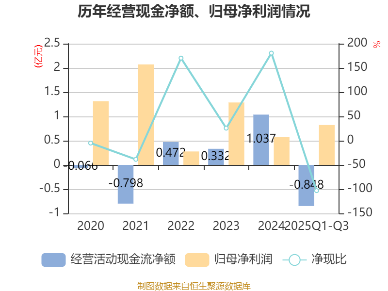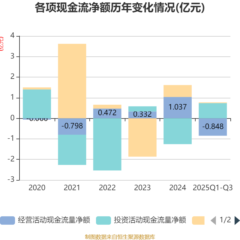 2025年前三季度,公司经营活动现金流净额为-8475.03万元,同比减少1.66亿元;筹资活动现金流净额356.62万元,同比减少5081.95万元;投资活动现金流净额7371.77万元,上年同期为-1.01亿元。