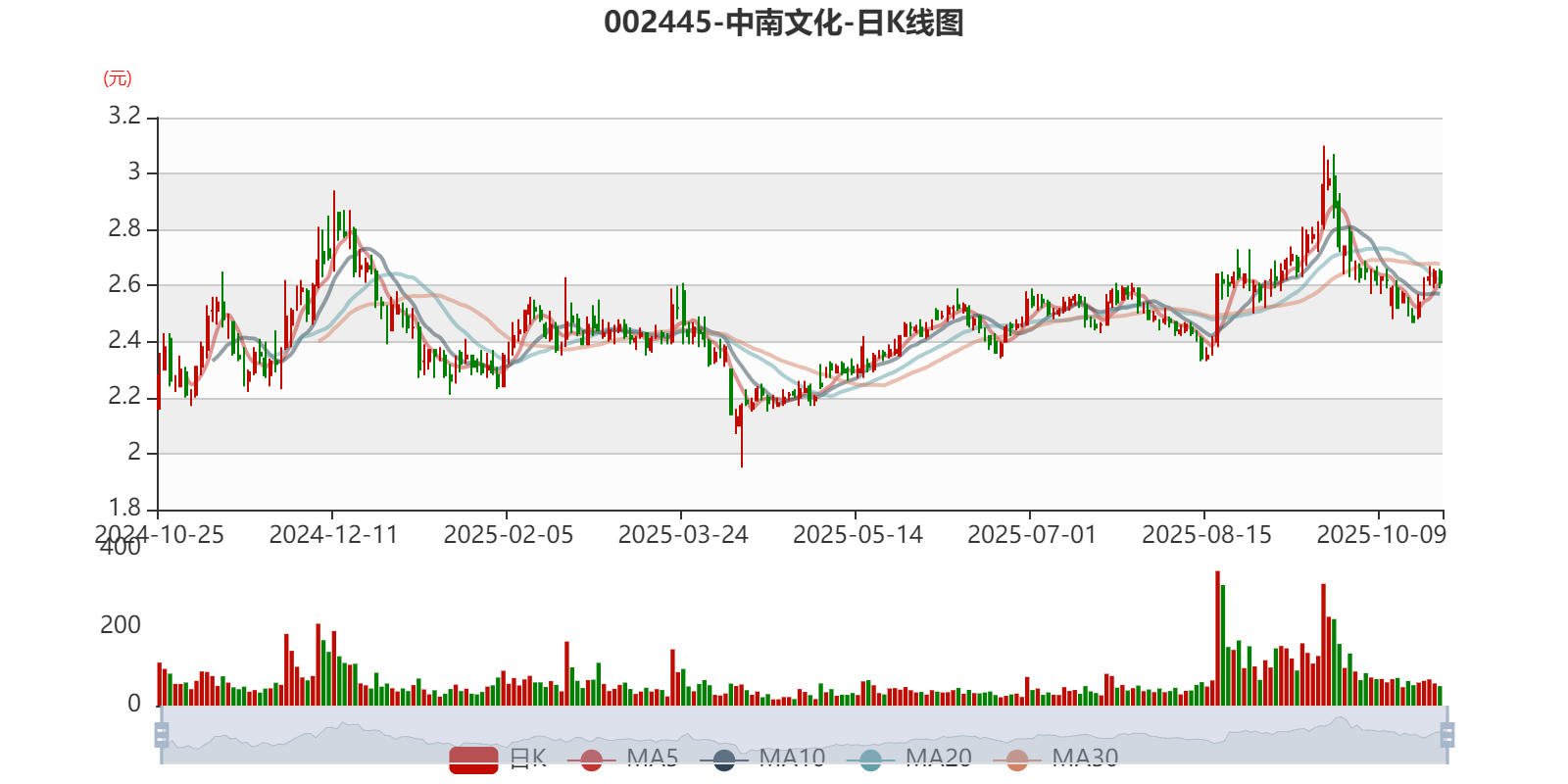 中证智能财讯中南文化(002445)10月25日披露2025年第三季度报告。前三季度公司实现营业总收入9.1亿元,同比增长40.10%;归母净利润8222.57万元,同比增长130.97%;扣非净利润4323.18万元,同比下降33.69%;经营活动产生的现金流量净额为-8475.03万元,上年同期为8139.74万元;报告期内,中南文化基本每股收益为0.0345元,加权平均净资产收益率为3.72%。