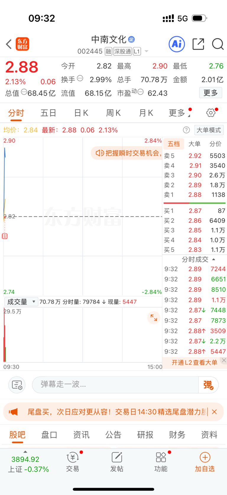 2.78低吸介入$中南文化(SZ002445)$ #强势机会# #实盘记录# #投资干货# #投资随笔#