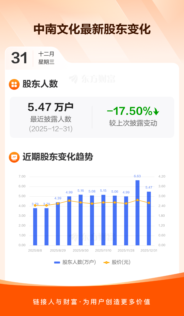 中南文化最新披露数据显示,截至12月31日公司股东户数为5.47万户,较上期(2025年12月10日)减少1.16万户,降幅为17.50%。户均持有流通股数量由上期的3.57万股上升至4.33万股,户均持股金额由上期的9.89万元增加至11.25万元。