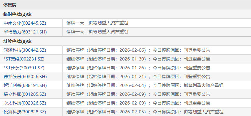 上证报中国证券网讯 2月13日,2家公司临停:中南文化、华培动力拟筹划重大资产重组。