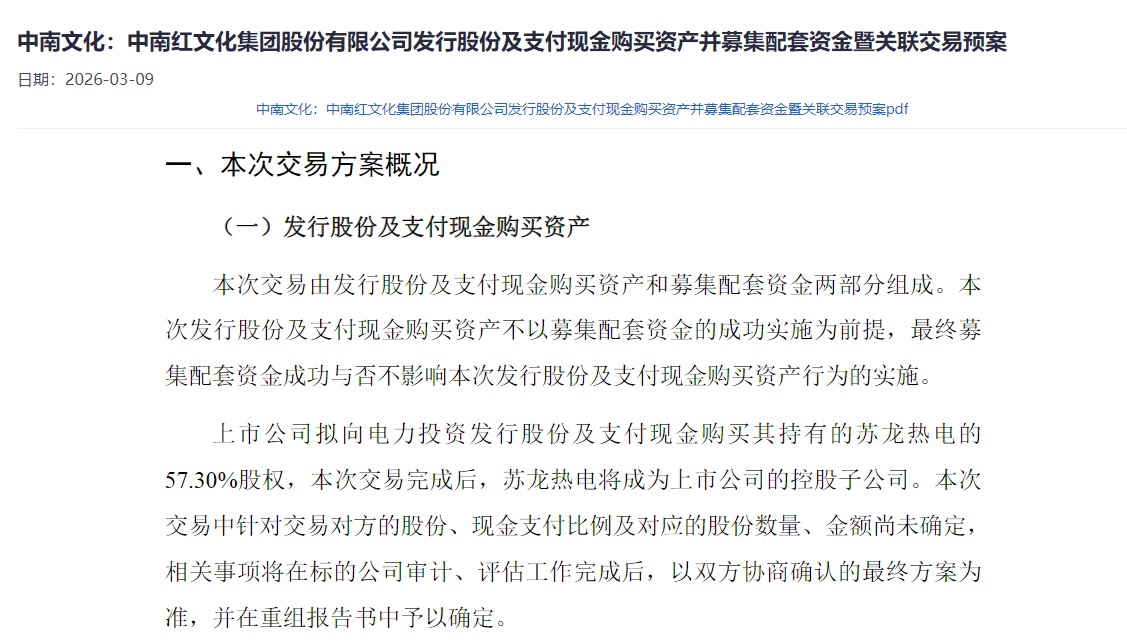 3月8日,中南文化发布了《中南红文化集团股份有限公司发行股份及支付现金购买资产并募集配套资金暨关联交易预案》。