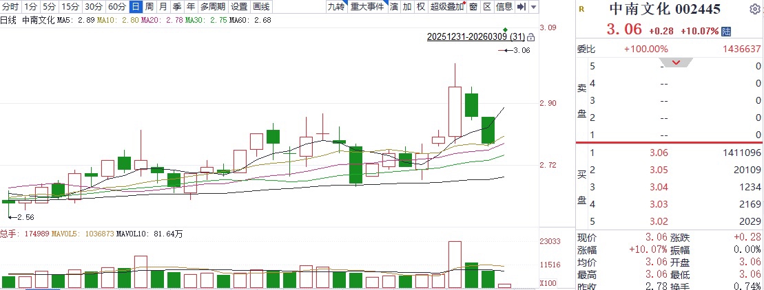 二级市场上,中南文化3月9日复牌后“一”字涨停,股价报收3.06元,全日换手率仅为0.74%,资金惜售心理明显。