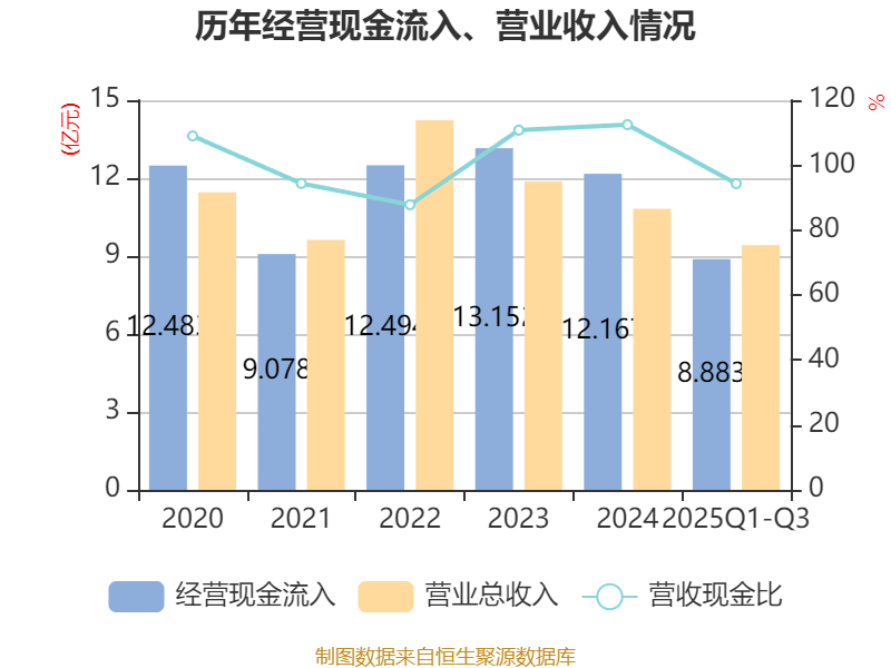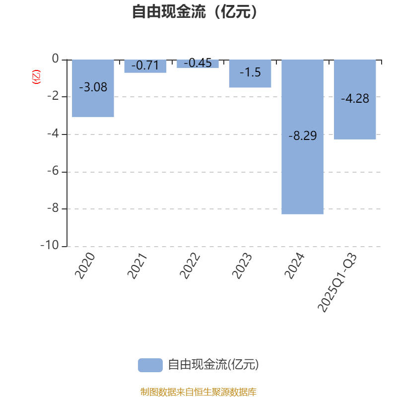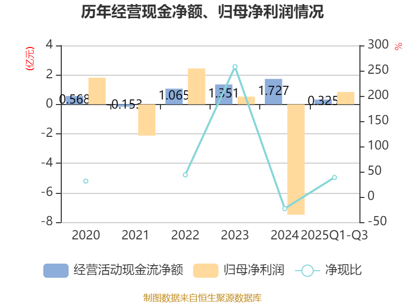 2025年前三季度,公司经营活动现金流净额为3247.72万元,同比下降74.51%;筹资活动现金流净额1.56亿元,同比增加2.66亿元;投资活动现金流净额-4.77亿元,上年同期为-2.54亿元。
