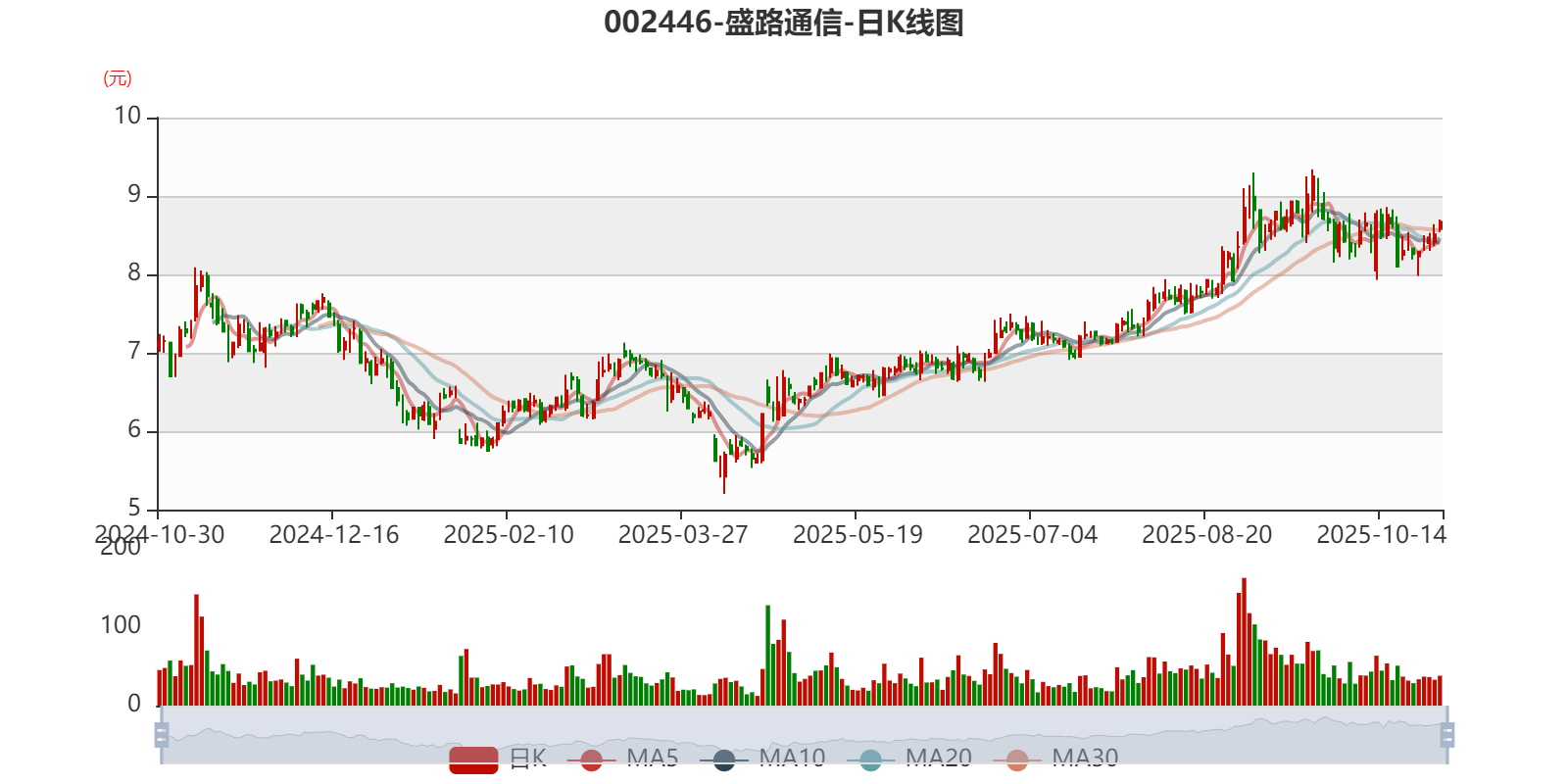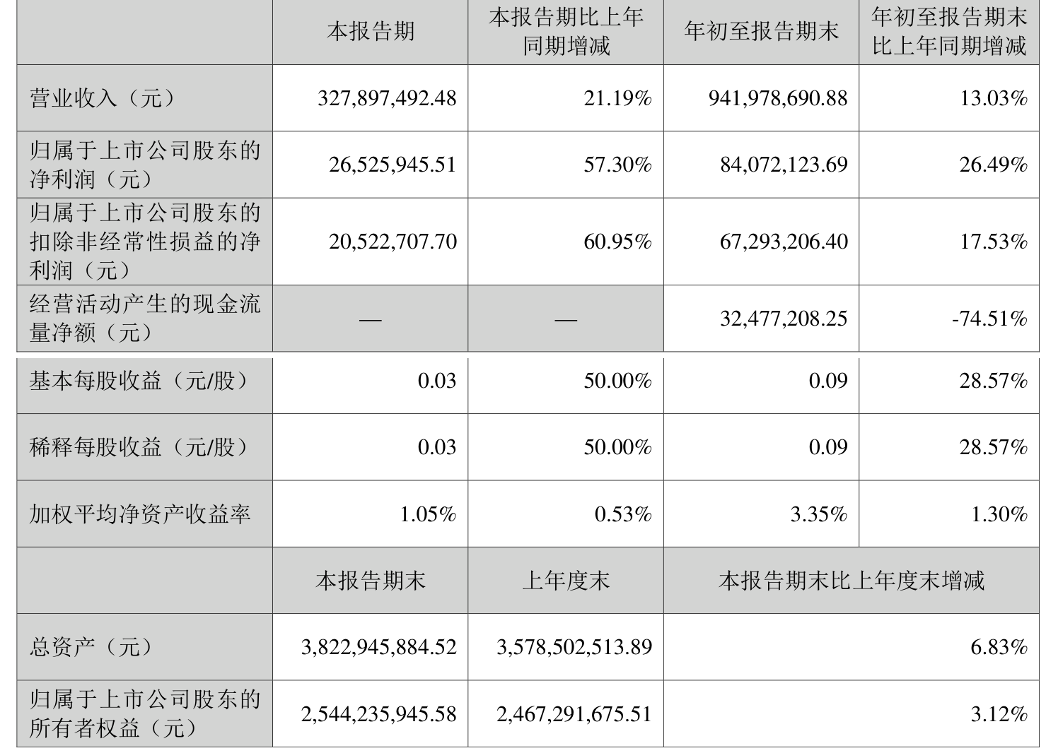 中证智能财讯盛路通信(002446)10月30日披露2025年第三季度报告。前三季度公司实现营业总收入9.42亿元,同比增长13.03%;归母净利润8407.21万元,同比增长26.49%;扣非净利润6729.32万元,同比增长17.53%;经营活动产生的现金流量净额为3247.72万元,同比下降74.51%;报告期内,盛路通信基本每股收益为0.09元,加权平均净资产收益率为3.35%。