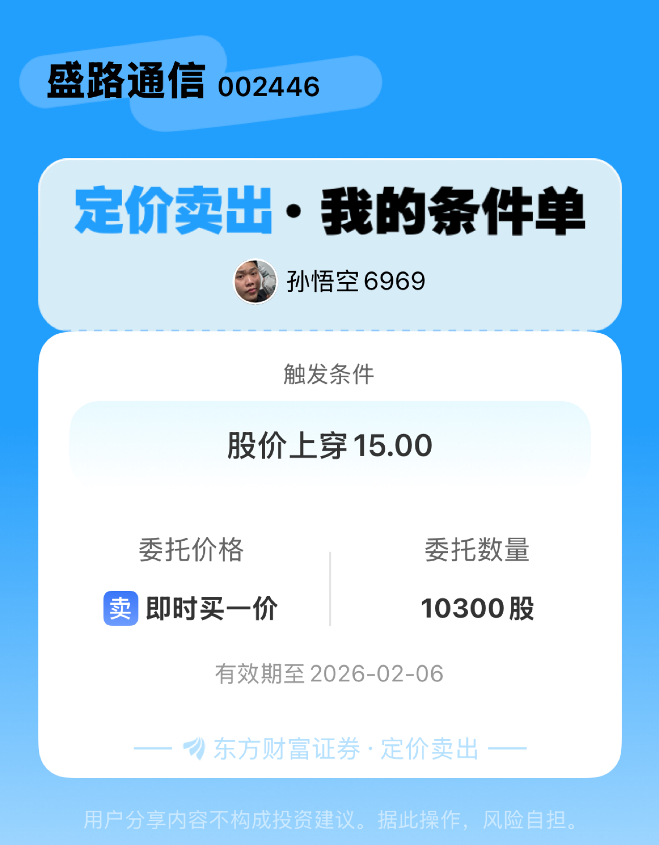 #条件单交流# #定价卖出晒单# 一位股神设置了一个定价卖出条件单,接下来就是见证奇迹的时刻~$盛路通信(SZ002446)$ 不到15一股不卖