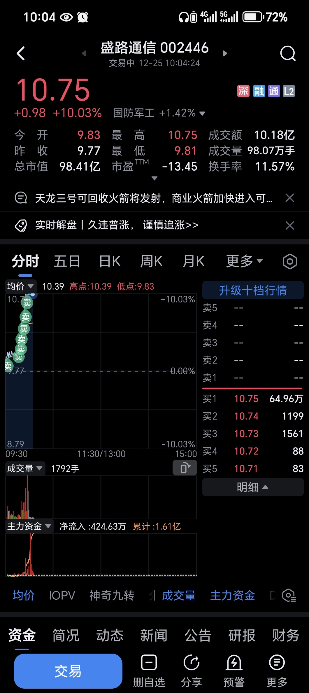 $盛路通信(SZ002446)$ 我算能一回,想着这次冲高回落,提前每涨一个点卖。直接挂完,结果。。。