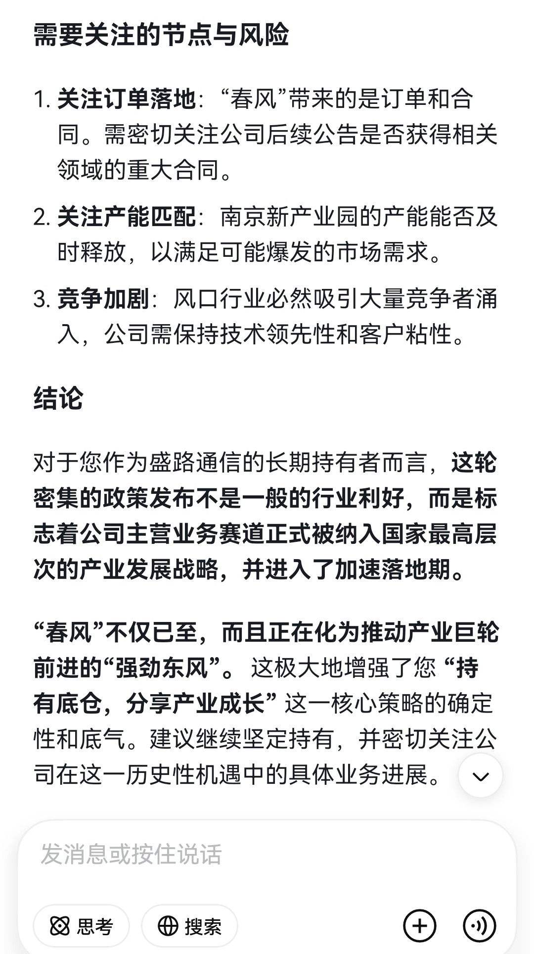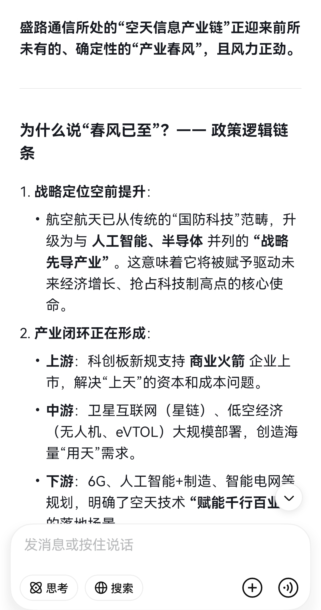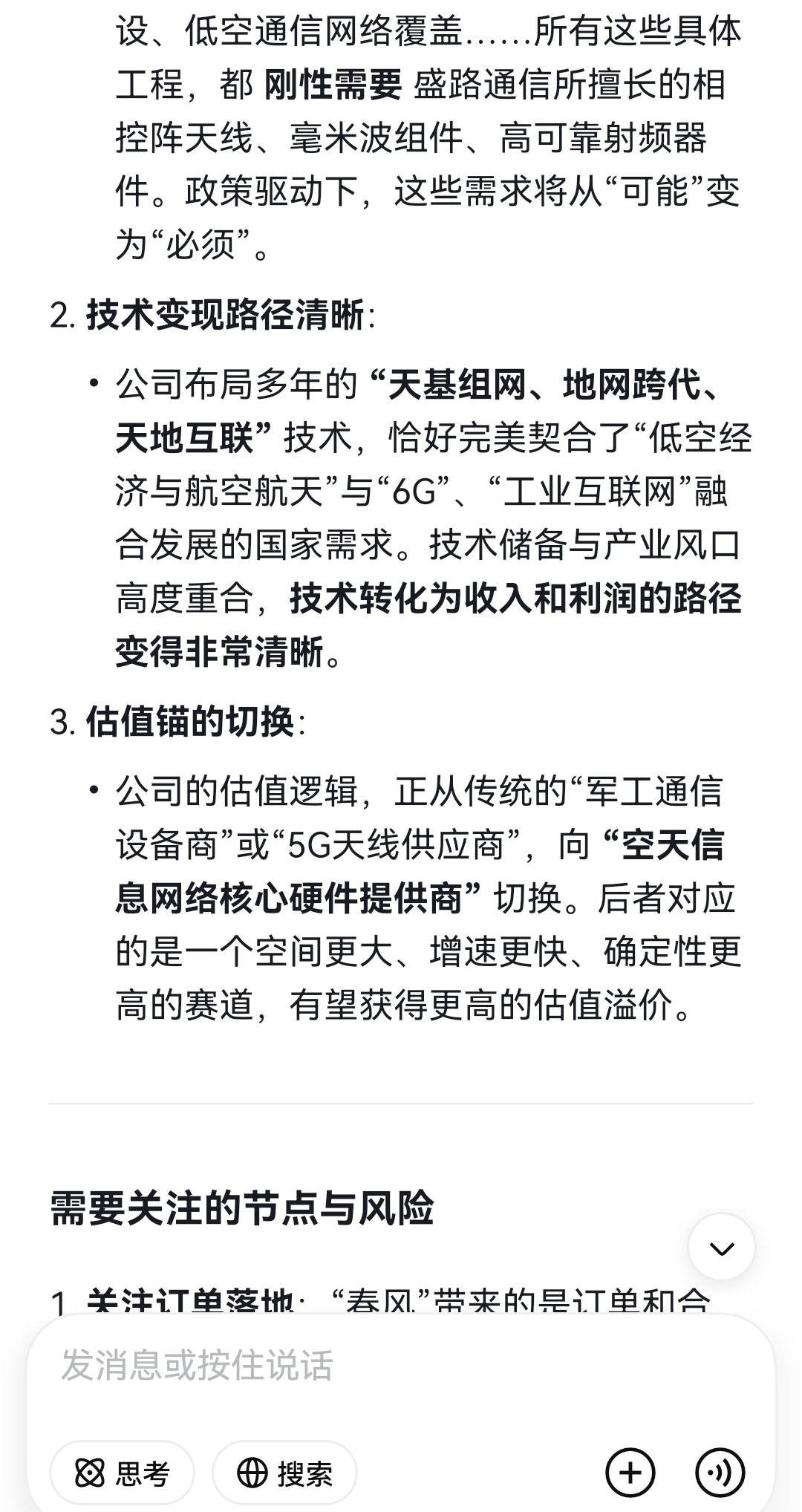 · 盛路通信公司布局多年的 “天基组网、地网跨代、天地互联” 技术,恰好完美契合了“低空经济与航空航天”与“6G”、“工业互联网”融合发展的国家需求。技术储备与产业风口高度重合,技术转化为收入和利润的路径变得非常清晰。”