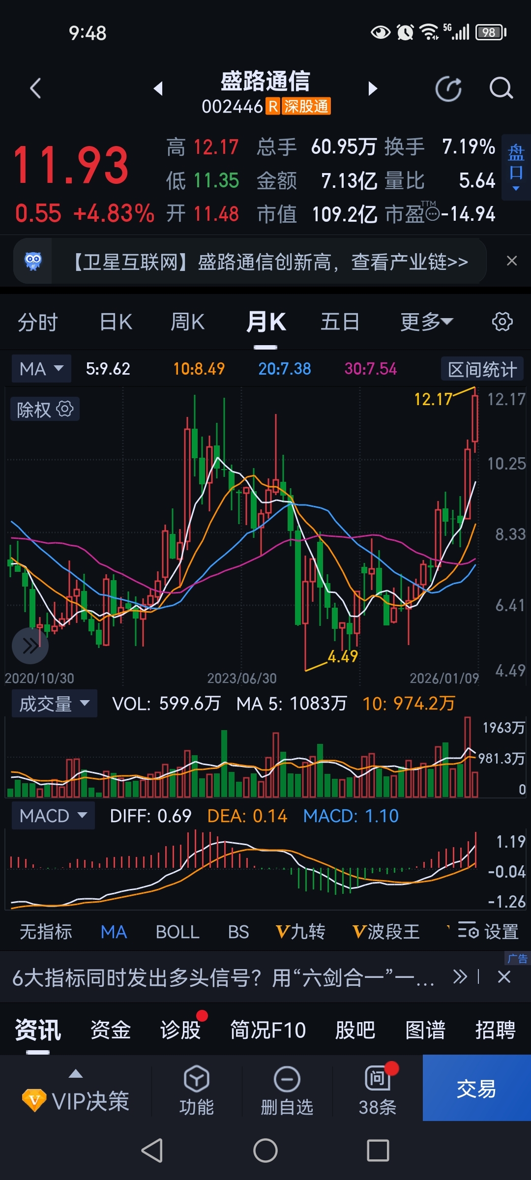 $盛路通信(SZ002446)$ 突破12元,创下三年以来的新高,彻底打开上涨空间,暂不言顶!