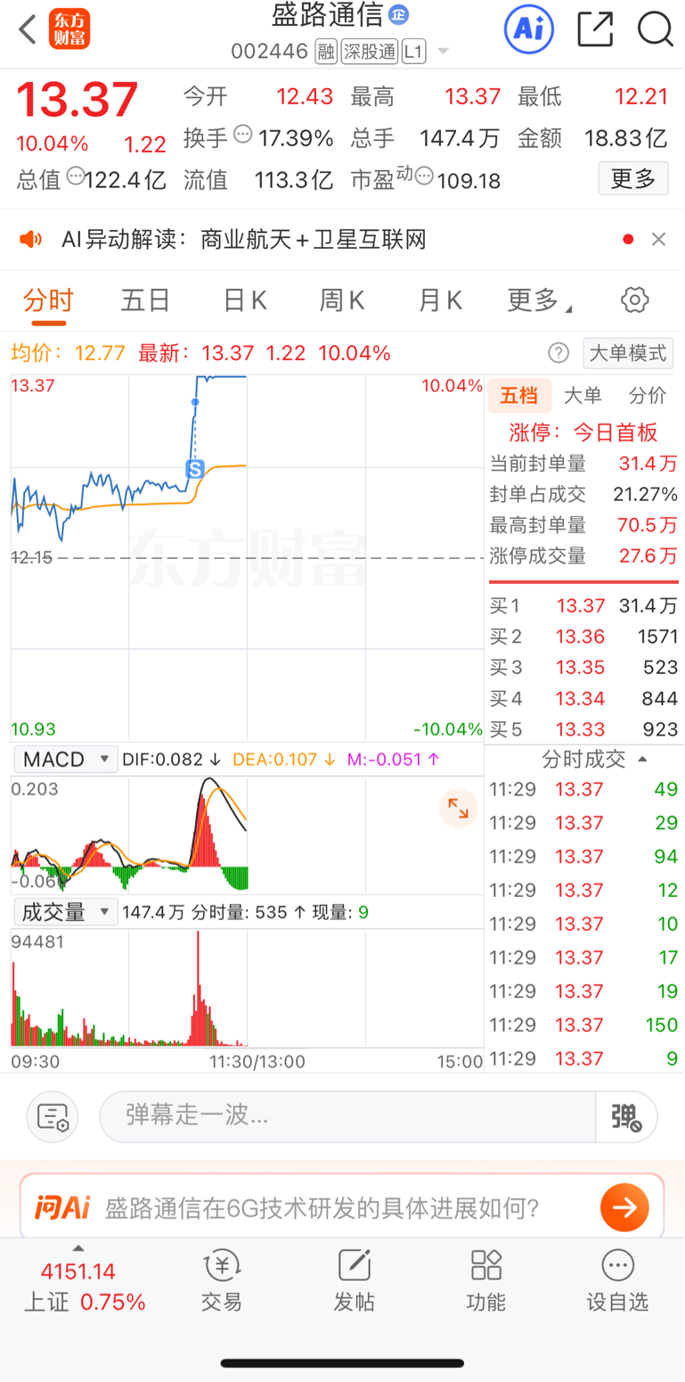 $盛路通信(SZ002446)$ 提前挂单,万万没想到能直接涨停,飞了