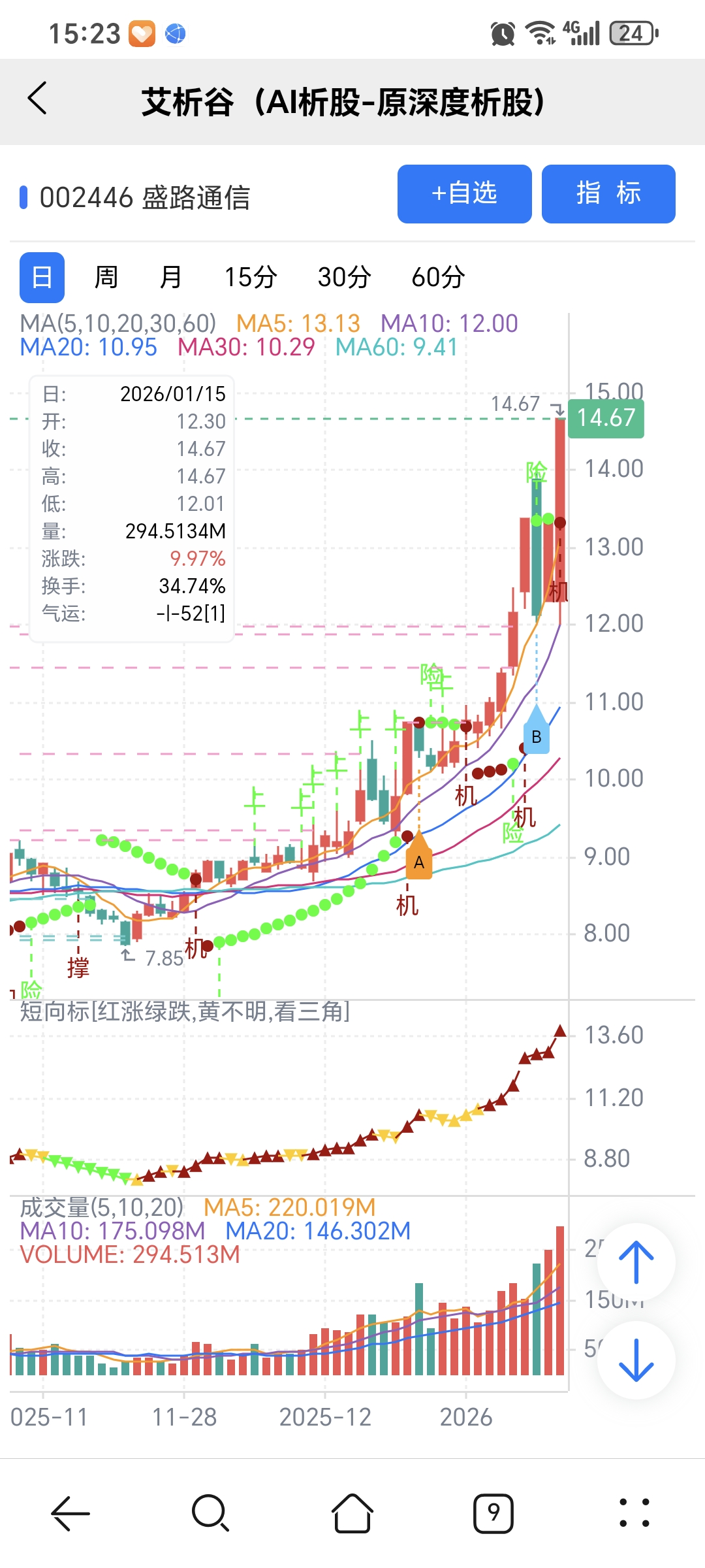 红绿小圆点是艾析谷的量化指标-艾短波,是趋势跟踪+突破类的量化指标,完全免费。